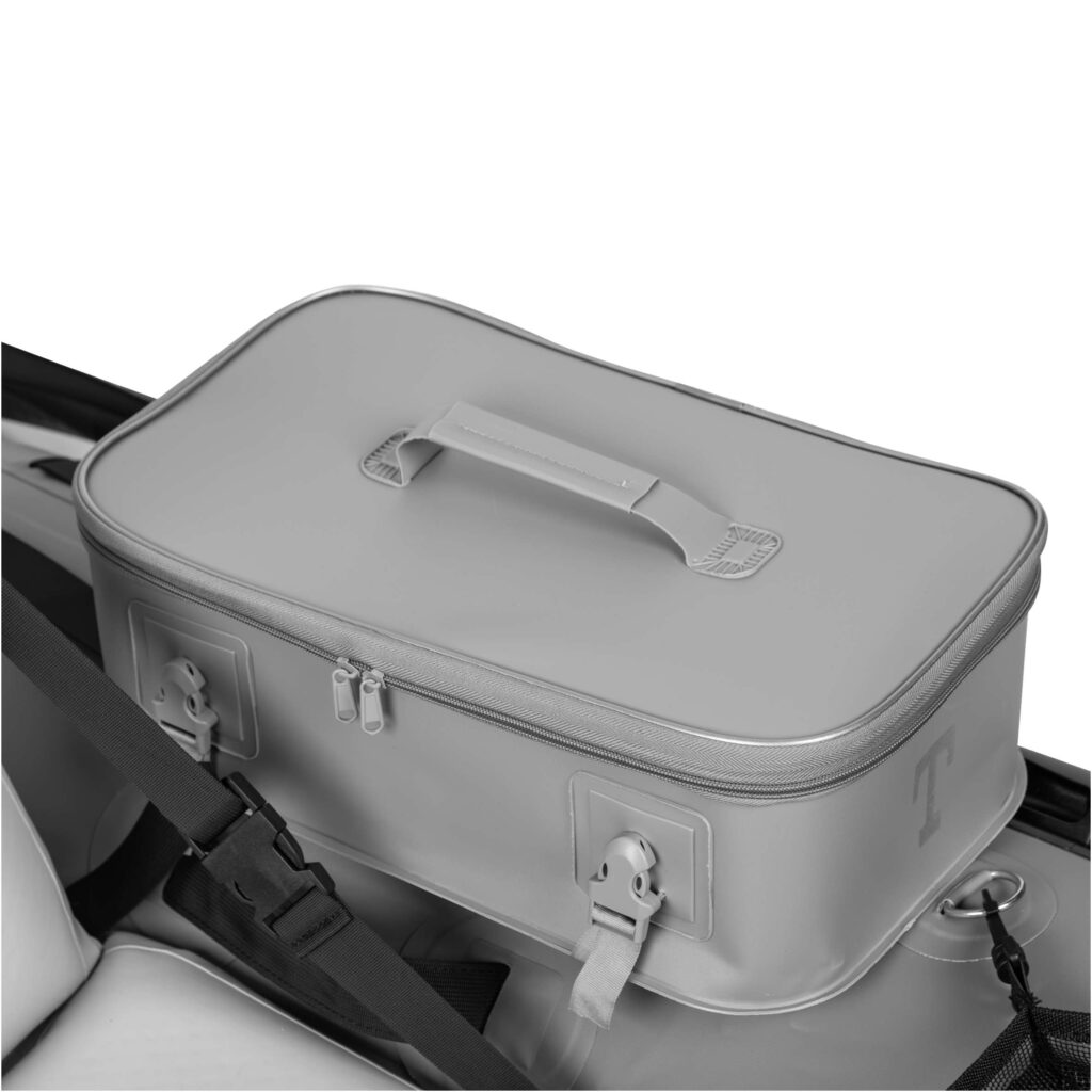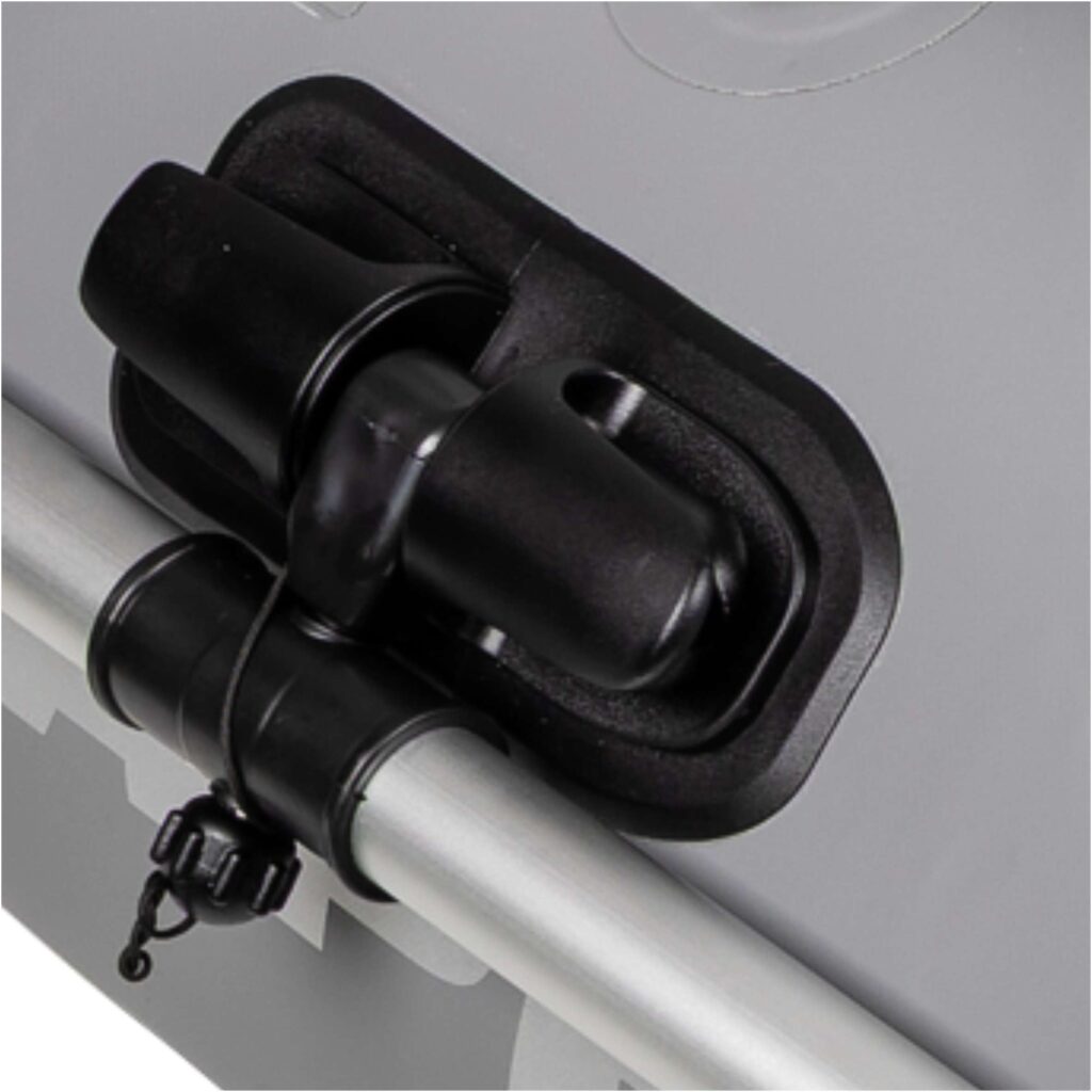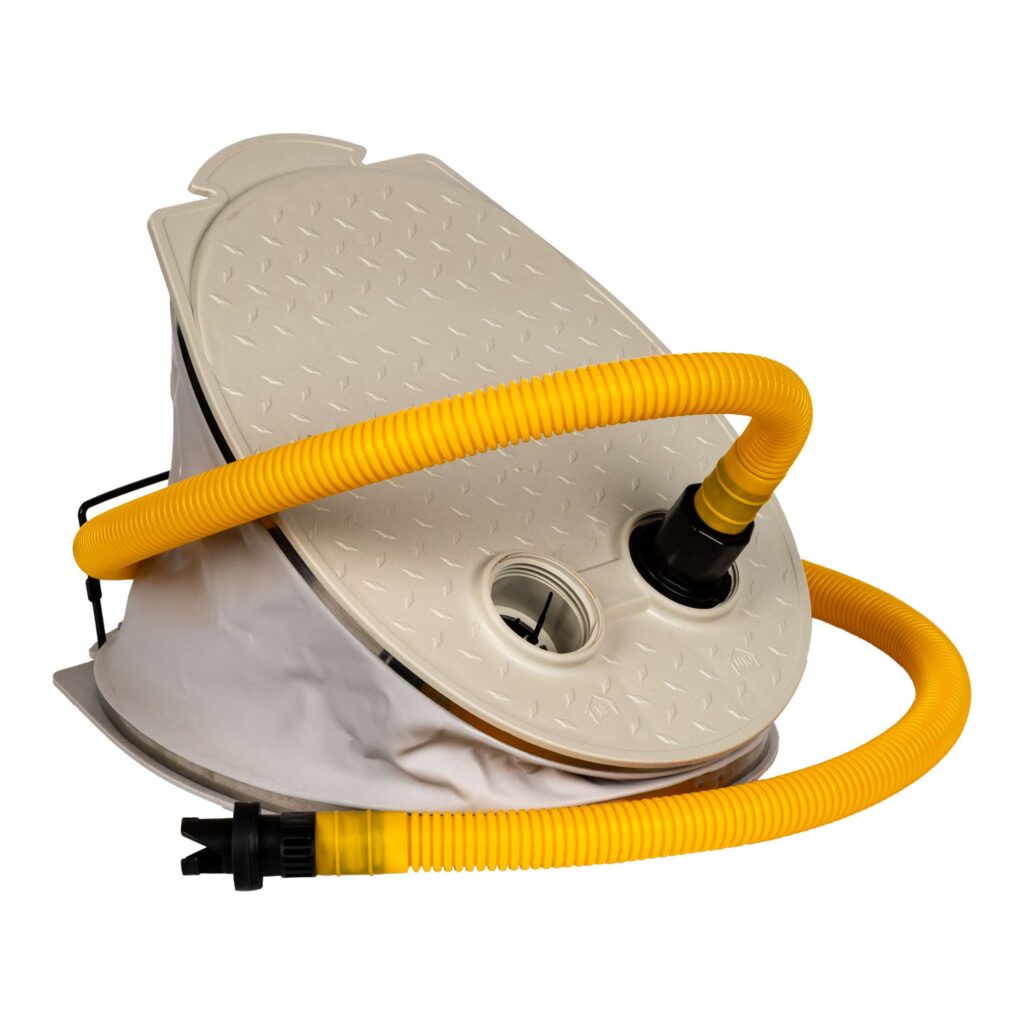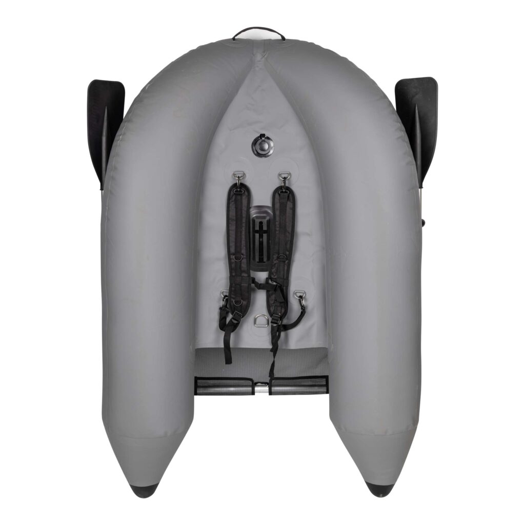 z zamykanym gniazdem na przewody. Dla wygodnego przenoszenia napompowanego sprzętu, pod podłogą umieszczono metalowe D-ringi do pasów naramiennych, zawartych w komplecie wraz z torbą, pompką i zestawem naprawczym