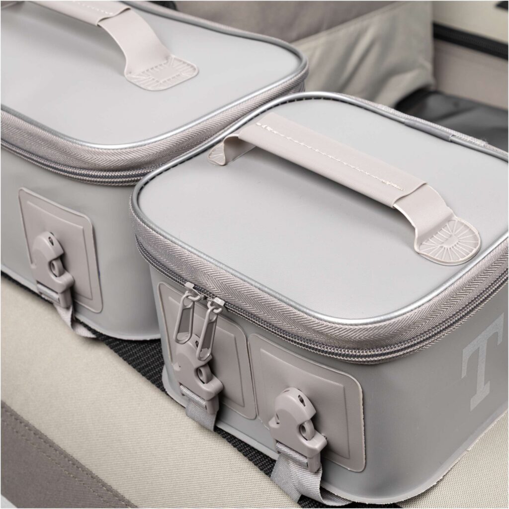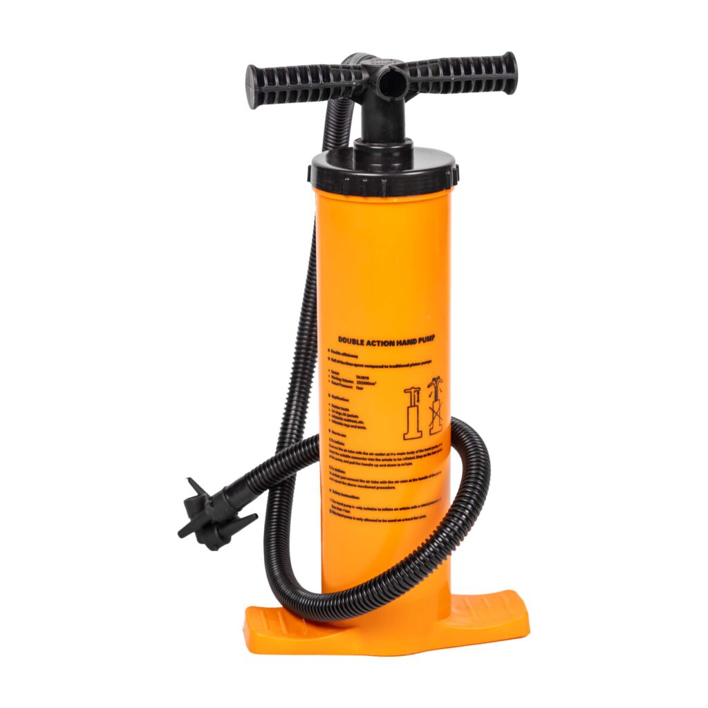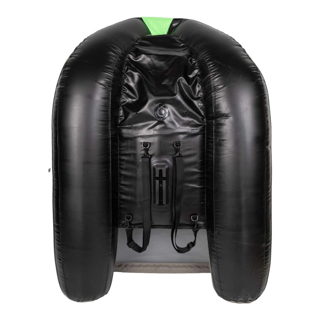 The Active Belly Boat is combined of two separate inflatable PVC tubes placed in the sewn robust cover. The tube case is made of the extremely robust, waterproof and tearproof 600 D fabric. The bottom part of the belly boat is strengthened with the thick PVC. Thanks to these solutions the belly boat does not resist in the water while driving and protects against the algae. The belly boat is equipped with: comfortable, inflatable armchair with the elastic net pocket, three PVC containers, safety bar with the silicone coated unhooking net. There are two D-rings on the bow for anchor mounting etc. There is an electric motor mount under the bottom with the closed cable slot. Four D-rings on the bottom for transportation belts mounting. The set comes complete with pump, repair kit and the vast carrying bag.